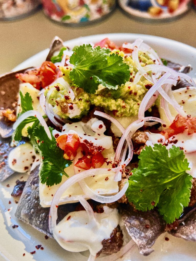Lo primero y más importante: dorar la carne y la chistorra en una sartén hasta que esté muy fritita y crujiente. Colocamos los nachos en un plato y repartimos la carne por encima, ponemos el queso y ayudamos a que funda en el horno si fuera necesario. Después ponemos una cucharada de guacamole, el tomate picado, unas hojas de cilantro y chile. Toque de pimienta y aceite de oliva. Listo para comer con la manos y mancharnos el hocico.