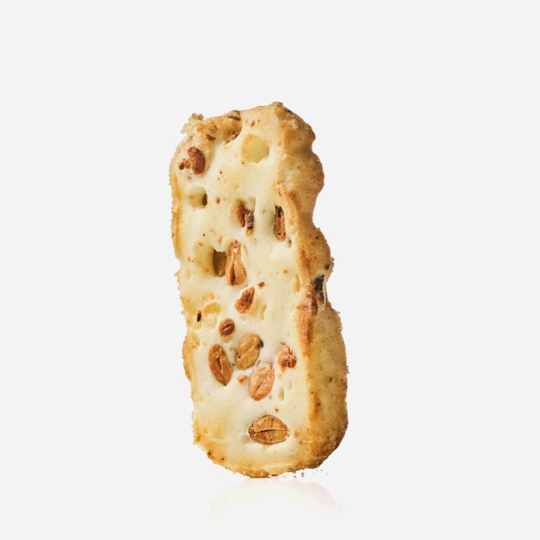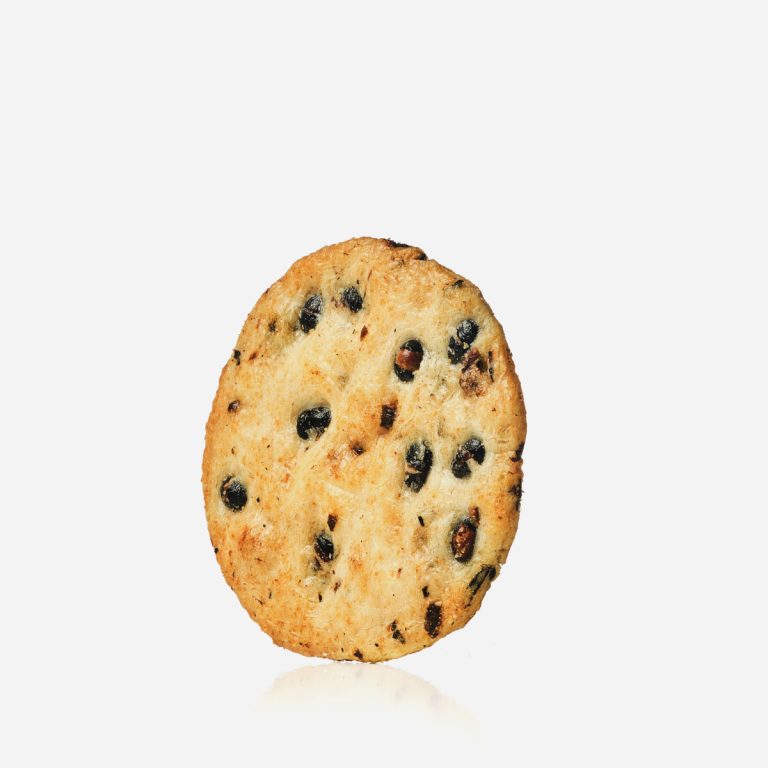 Judías negras enteras, cocidas al vapor para resaltar su dulzor natural, se integran en un cracker de arroz horneado, crujiente y dorado. Vegano y sin gluten, destaca por su sabor limpio y auténtico. Medidas: 7,5×7,8×0,5 cm.